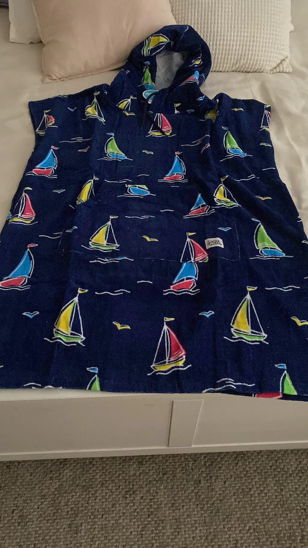 Ponchossa on iso huppu ja kätevät aukot sivuilla, jotta uima-asun pukeminen ja riisuminen on mutkatonta!
